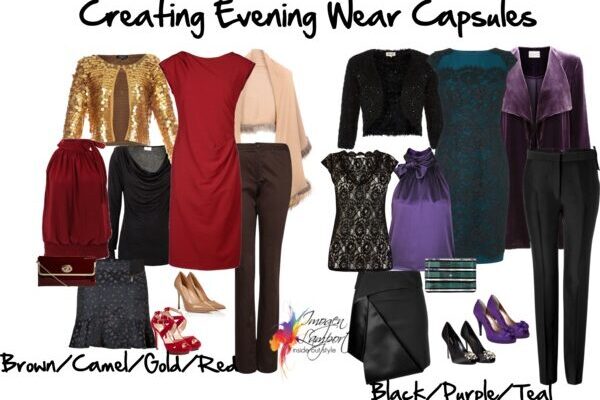 Here you’ll see I’ve created two evening wear capsules, using a few colours that work together so you can easily mix and match. Each of these capsules will create 10 different looks. Add one extra top that goes with all the other elements and you will have an extra 4 outfit options to wear!